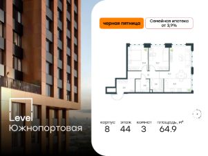 В северной части района Печатники продается 3-комнатная квартира площадью 64.90 кв.м без отделки. Квартира расположена на 44 этаже 49-этажного корпуса Корпус 8 в жилом комплексе комфорт-класса Level Южнопортовая (компания Level Group/Левел групп).