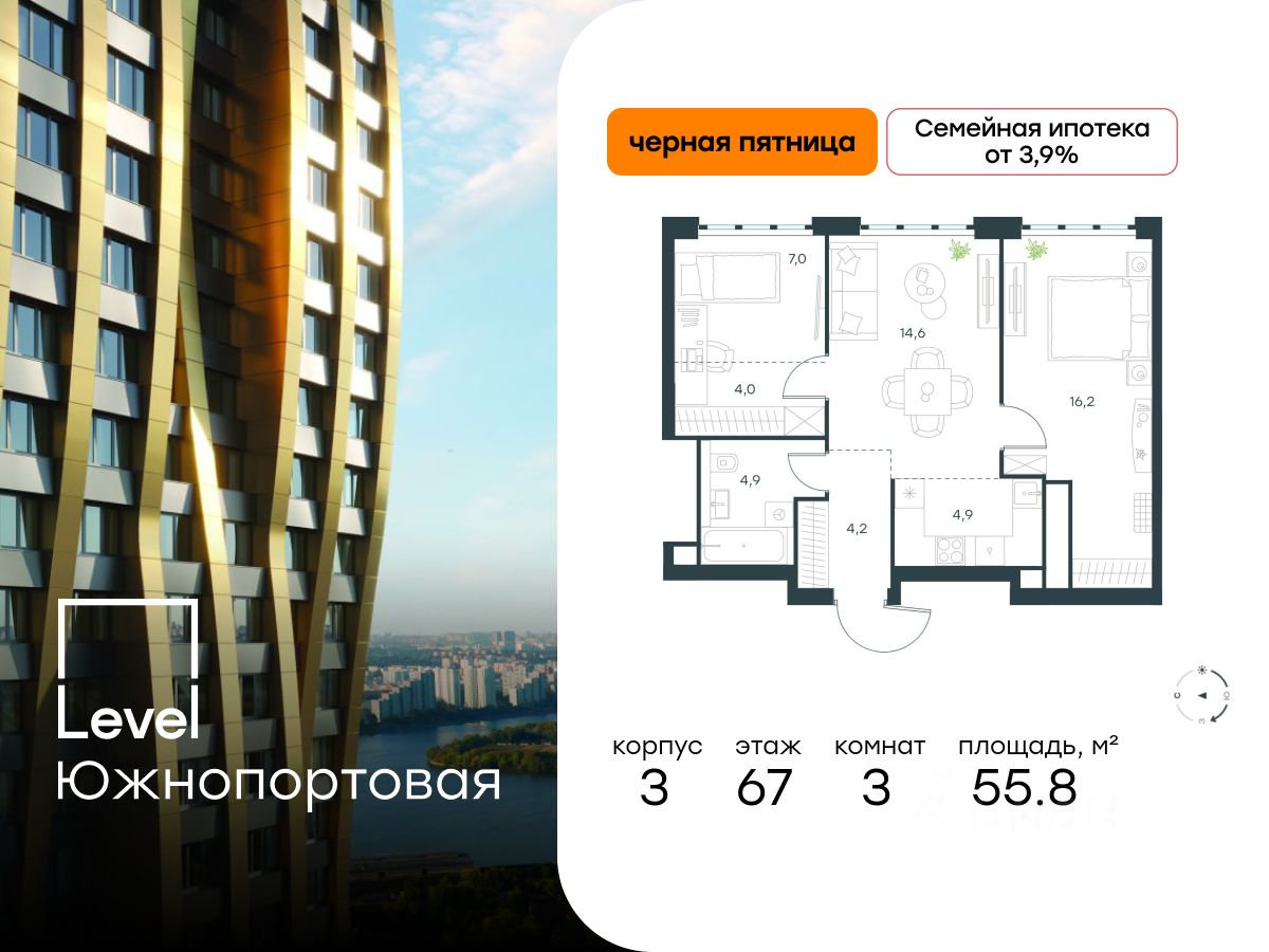 В северной части района Печатники продается 3-комнатная квартира площадью 55.80 кв.м без отделки. Квартира расположена на 67 этаже 68-этажного корпуса Корпус 3 в жилом комплексе комфорт-класса Level Южнопортовая (компания Level Group/Левел групп).