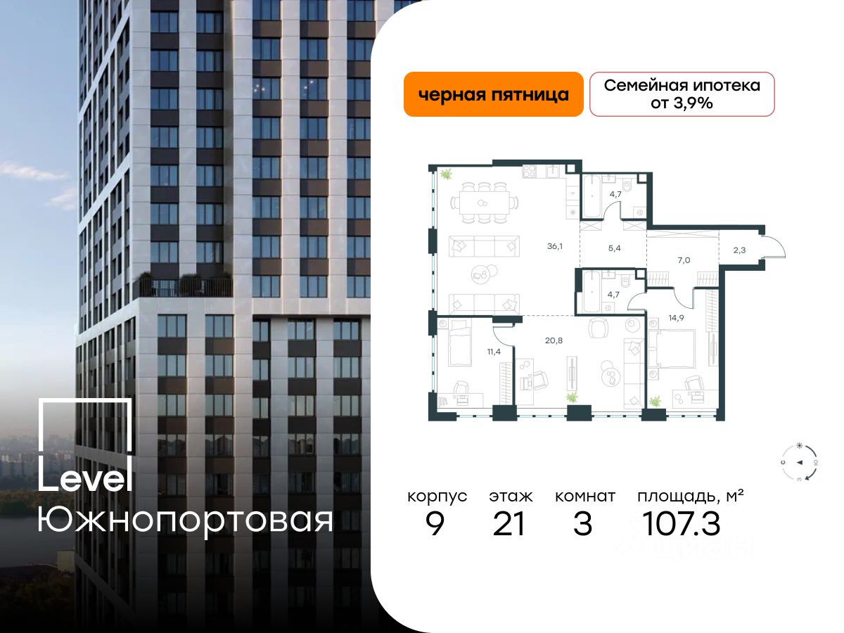 В северной части района Печатники продается 3-комнатная квартира площадью 107.30 кв.м с отделкой white box. Квартира расположена на 21 этаже 49-этажного корпуса Корпус 9 в жилом комплексе комфорт-класса Level Южнопортовая (компания Level Group/Левел групп).