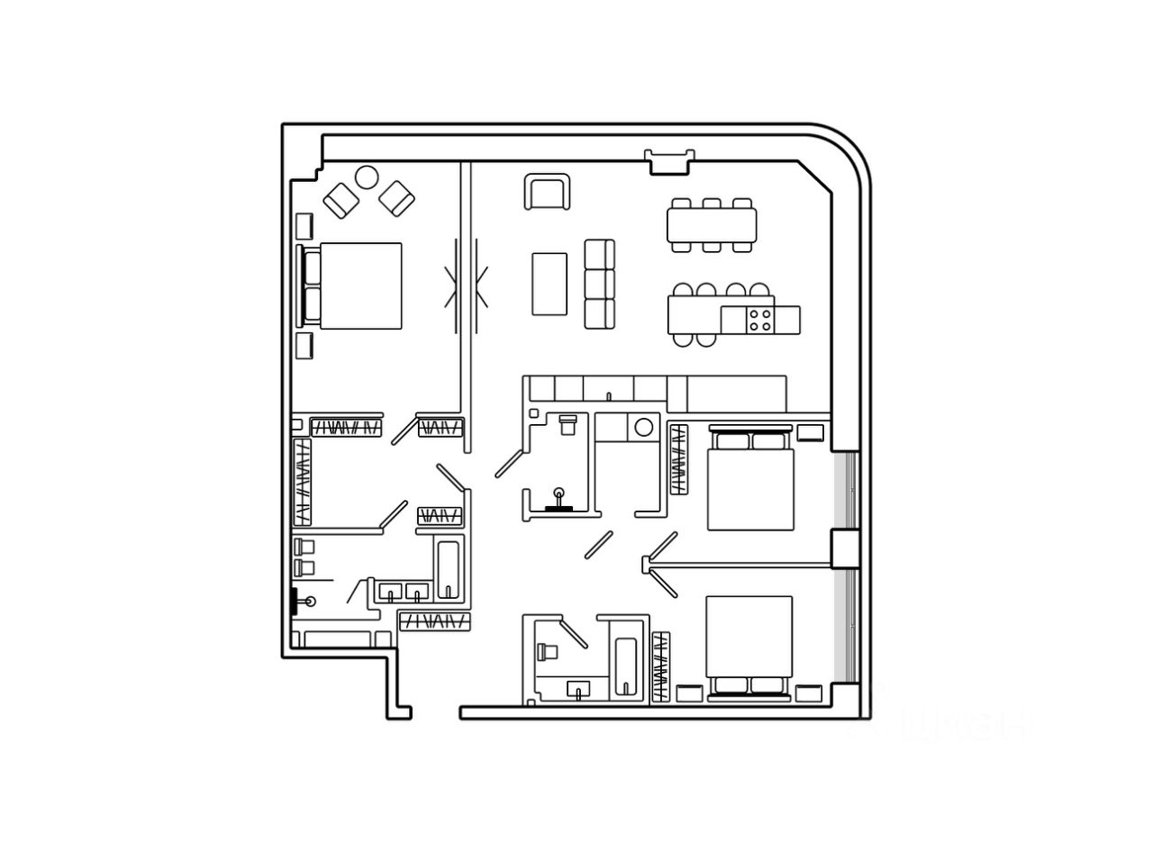 Планировочное решение: кухня-гостиная со столовой зоной и мягкой зоной отдыха, мастер-спальня с собственной гардеробной и ванной комнатой, 2 спальни со своими санузлами, гостевой санузел, постирочная.