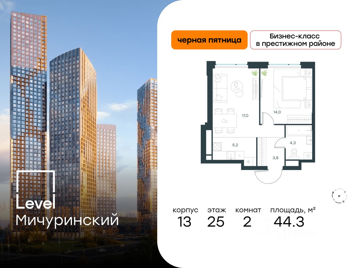 В жилом квартале, расположенном на границе с природным заказником "Долина реки Очаковки", продаётся 2-комнатная квартира площадью 44.30 кв.м без отделки. Квартира расположена на 25 этаже 31-этажного корпуса Корпус 13 в жилом комплексе бизнес-класса Level Мичуринский (компания Level Group/Левел групп).