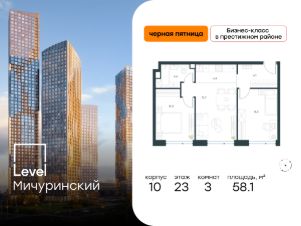 В жилом квартале, расположенном на границе с природным заказником "Долина реки Очаковки", продаётся 3-комнатная квартира площадью 58.10 кв.м с отделкой white box. Квартира расположена на 23 этаже 42-этажного корпуса Корпус 10 в жилом комплексе бизнес-класса Level Мичуринский (компания Level Group/Левел групп).