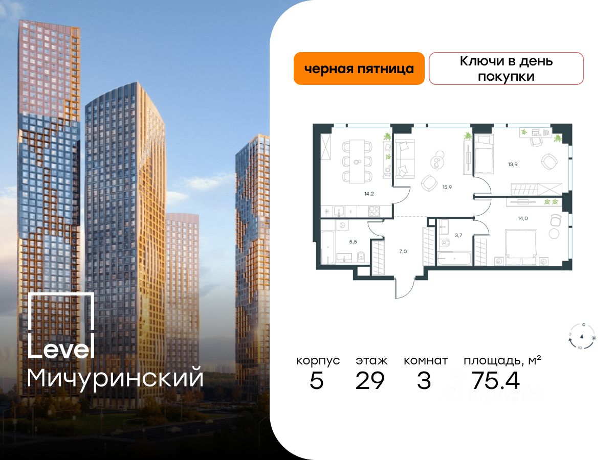 В жилом квартале, расположенном на границе с природным заказником "Долина реки Очаковки", продаётся 3-комнатная квартира площадью 75.40 кв.м с отделкой white box. Квартира расположена на 29 этаже 37-этажного корпуса Корпус 5 в жилом комплексе бизнес-класса Level Мичуринский (компания Level Group/Левел групп).