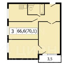 Общая площадь квартиры - 66,6 кв.м., линейная планировка - все окна квартиры смотрят на Рябиновую улицу. Комнаты смежно-изолированные - вход в одну спальню через гостиную, третья комната изолированная. Совмещенный санузел, есть застекленный и утепленный балкон.