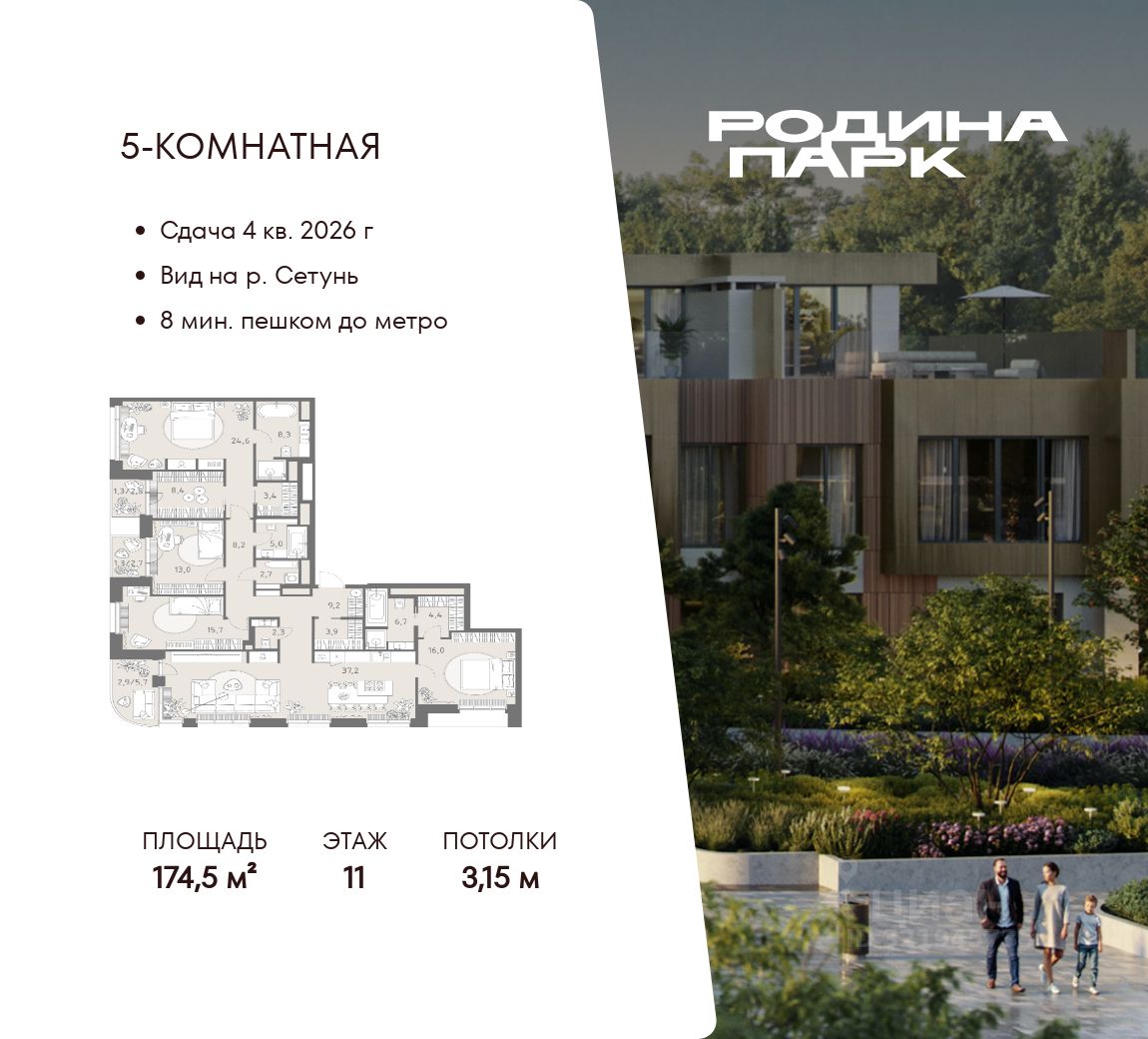 В жилом кластере Родина Парк рядом с природным заказником Долина реки Сетунь продаётся 5-комнатная квартира.