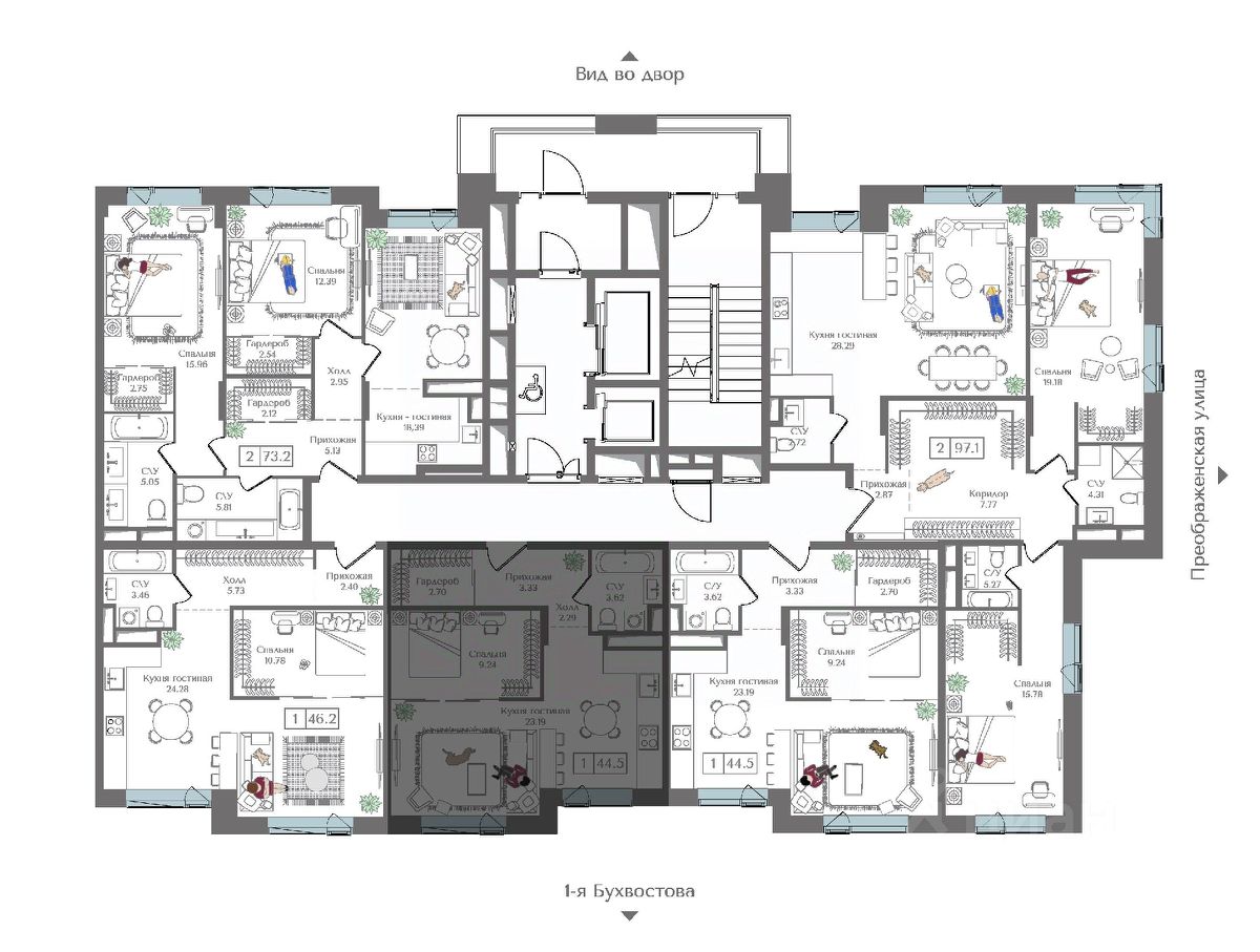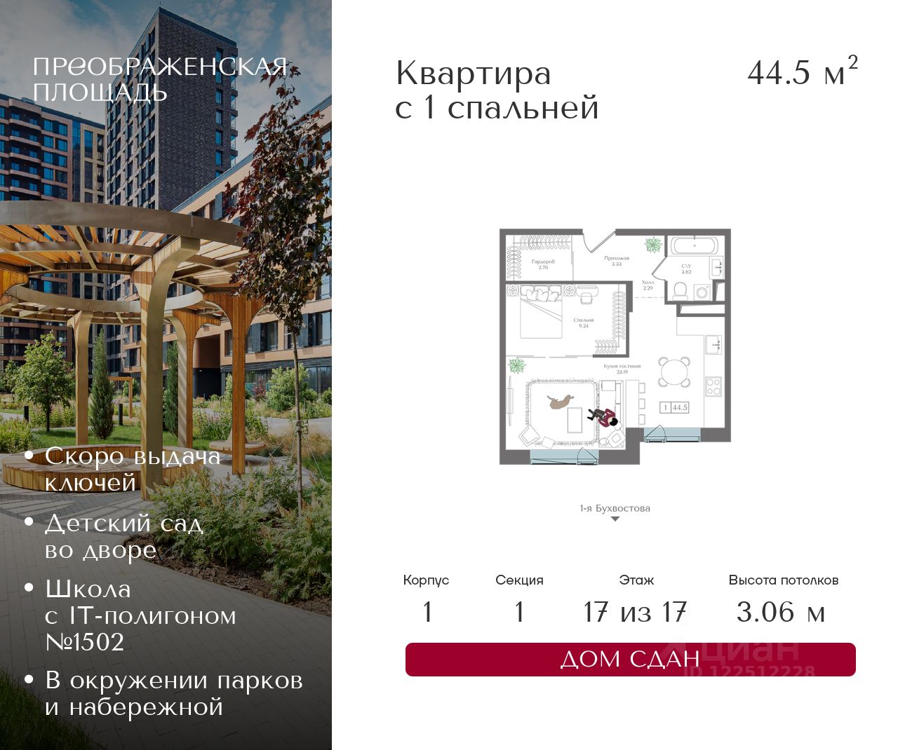 Квартира на 17 этаже в жилом комплексе премиум-класса "Преображенская площадь". Общая площадь: 44.5 кв.м.