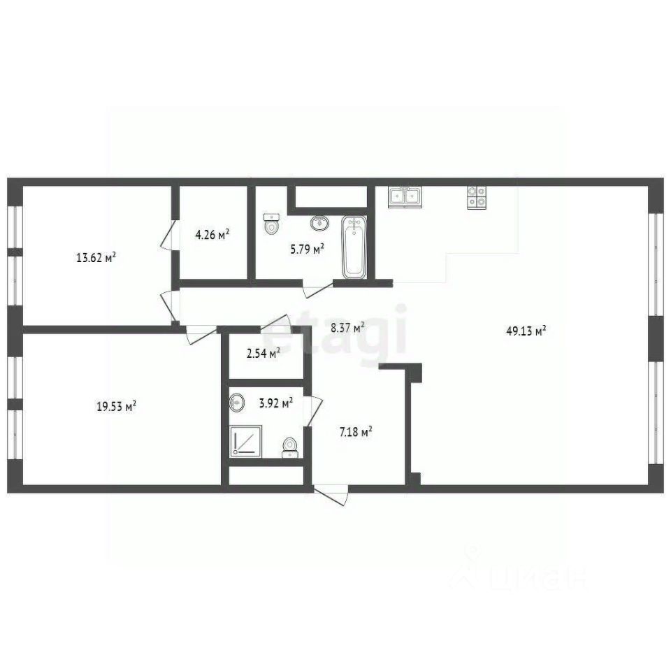 - кухня-гостиная 49.13 м2, изолированные комнаты 19.53 м2 и 13.62 м2 с гардеробной 4.26 м2, два санузла 5.79 м2 и 3.92 м2, постирочная комната 2.54 м2 и коридор 7.18 м2. Есть возможность сделать 3 изолированные комнаты.
