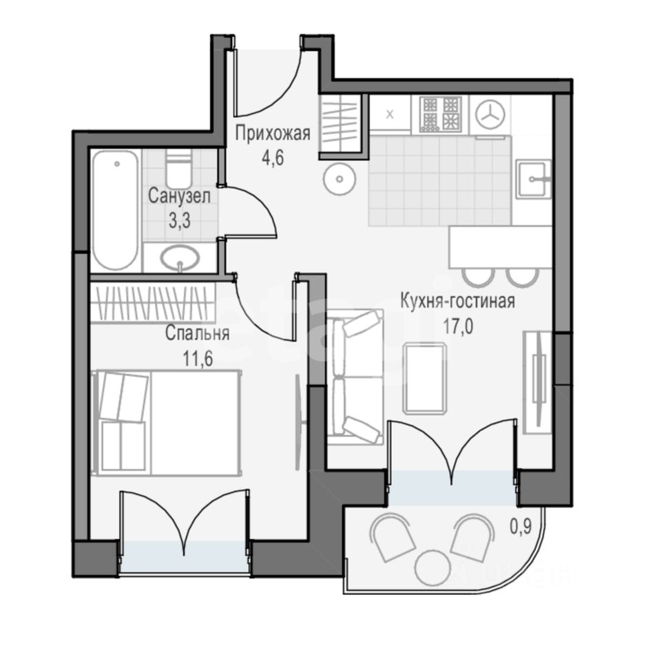 Функциональная евродвухкомнатная квартира: отдельная спальня 11,6 м², просторная кухня-гостиная 17 м² и балкон. Планировка без лишних коридоров — каждый метр работает на комфорт.