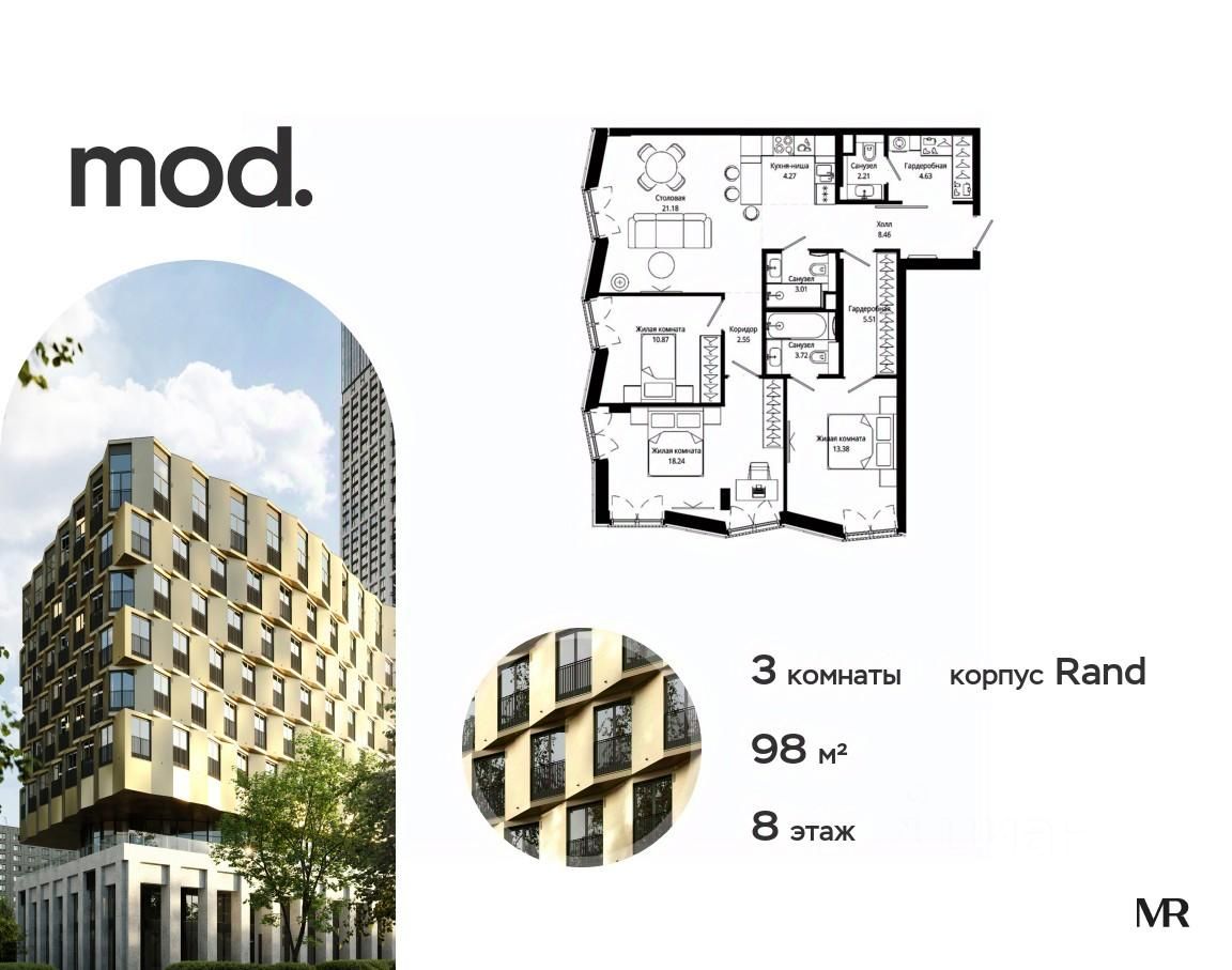 Продается 3-комнатная квартира площадью 98.03 м² с чистовой отделкой в ЖК Mod на 8-м этаже 9 этажного дома.