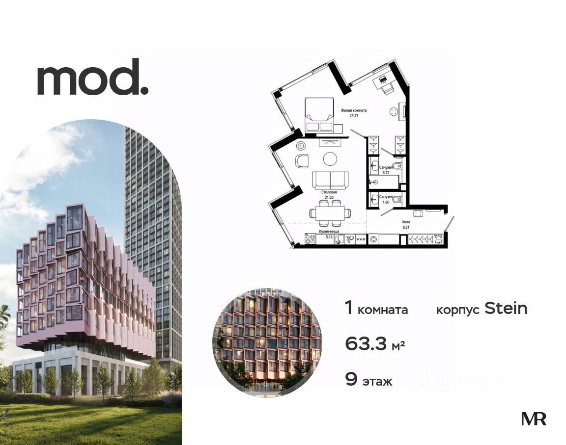 Продается 1-комнатная квартира общей площадью 63.32 м² с чистовой отделкой в ЖК Mod на 9-м этаже 9 этажного клубного дома.