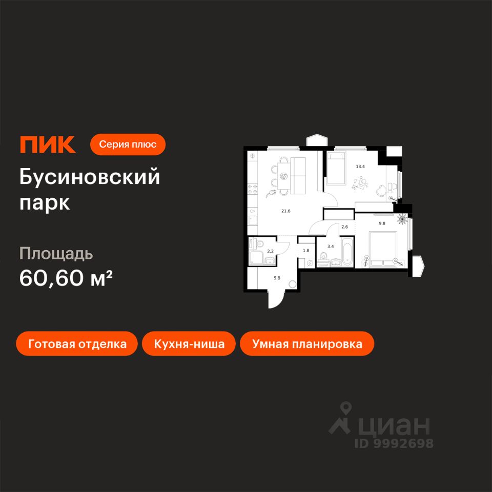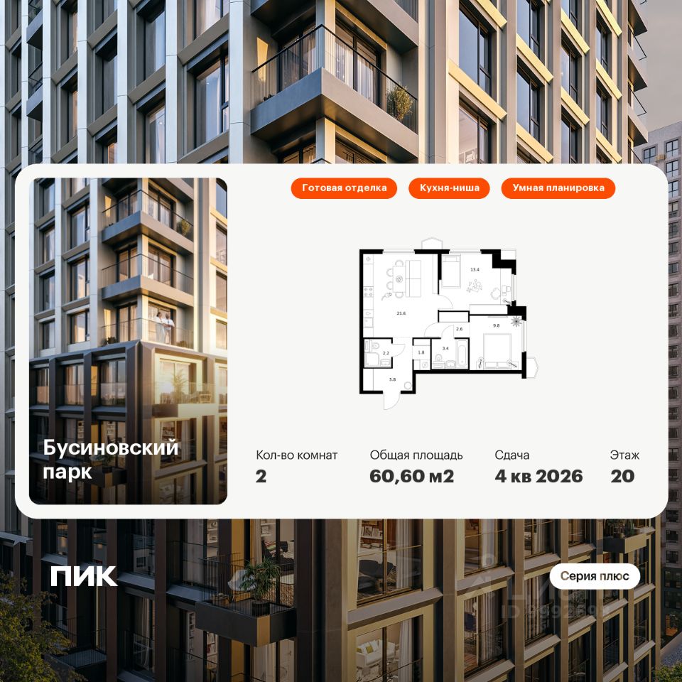 Продаётся 2-комн. квартира площадью 60,6 кв.м на 20 этаже 24 этажного дома (Корпус 22.4, Секция 4) проекта ПИК Бусиновский парк. Светлый просторный подъезд на уровне земли, функциональная планировка, большие окна, c отделкой.