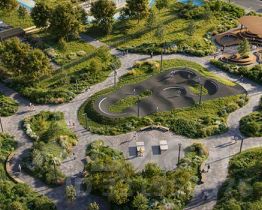 А специально для подростков мы спроектировали уникальное пространство для отдыха — памп-трек для катания, большой навес, амфитеатр и сетки для отдыха, где они смогут собираться вместе в любую погоду.