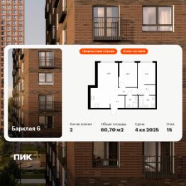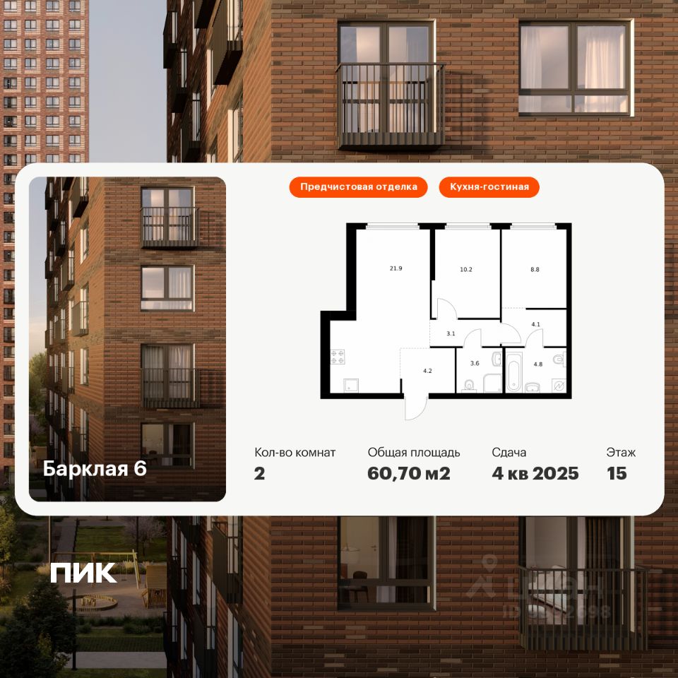Продаётся 2-комн. квартира площадью 60,7 кв.м на 15 этаже 32 этажного дома (Корпус 7, Секция 2) проекта ПИК Барклая 6. Светлый просторный подъезд на уровне земли, функциональная планировка, большие окна, предчистовая отделка.