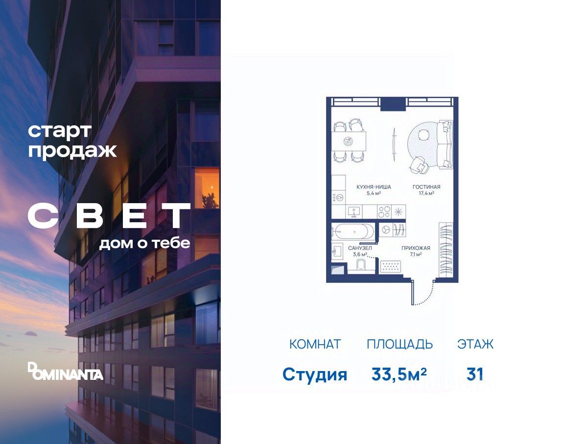 Продаётся студия 33.5 кв.м. на 31-м этаже 51 этажного дома.