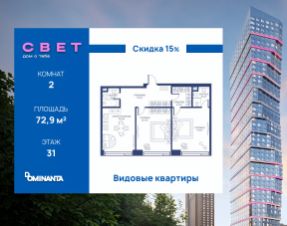 Продаётся 2-к квартира 72.9 кв.м. на 31-м этаже 51 этажного дома.