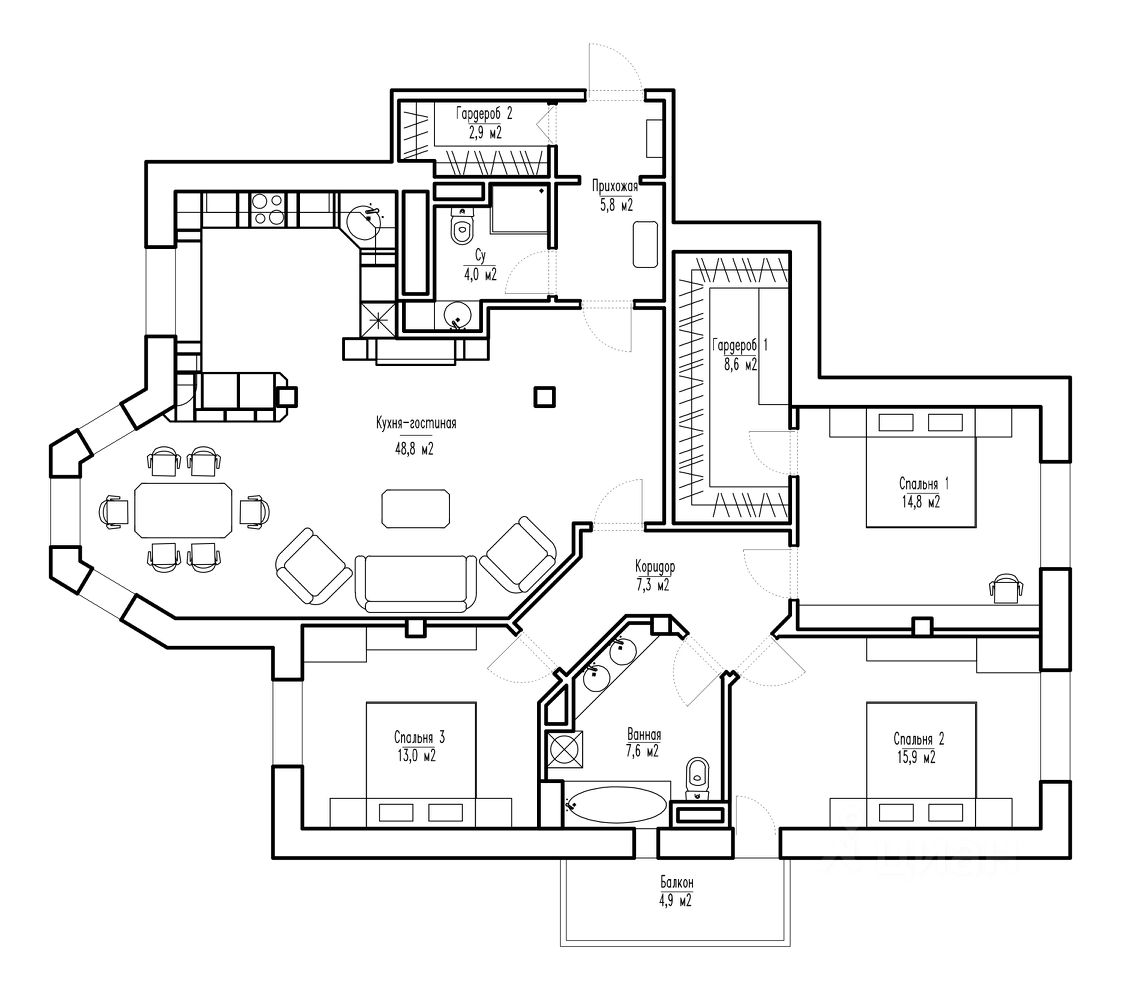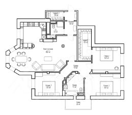 Планировка гостевой зоны включает просторную гостиную-столовую с кухней 49 м² с обеденной зоной с эркером, в центре гостиной биокамин с живым пламенем огня создает уют, статус и особую атмосферу, гостевой санузел, прихожую-гардеробную и зеркальный холл с подсветкой. В спальной зоне обустроена мастер-спальня с гардеробной и две спальни с ванной комнатой и лоджией.