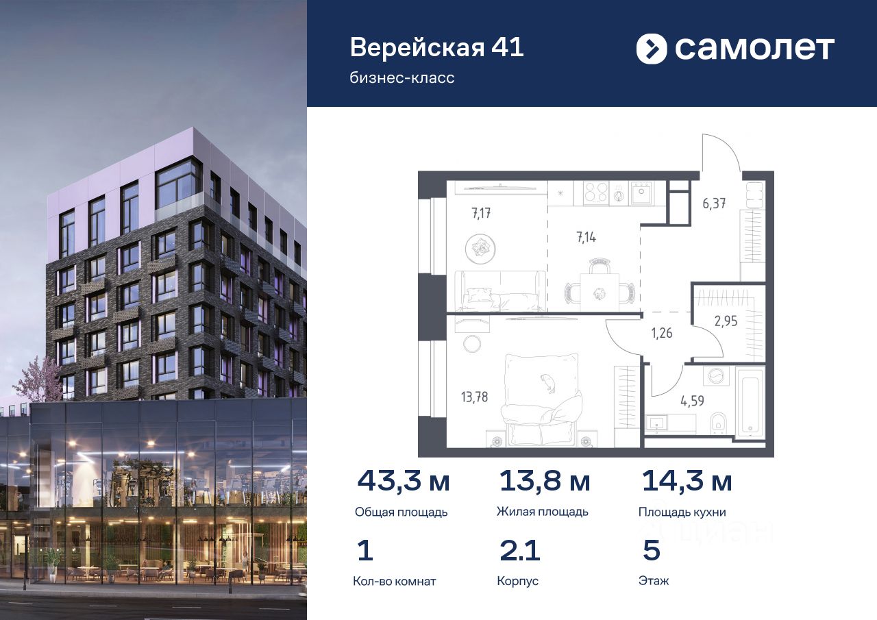 Предлагается 1-комнатная квартира бизнес-класса 43,26 кв.м в корпусе 2.1 на 5 этаже, в "Верейская 41"
