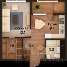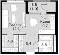- Кухня — 9.7 м² + лоджия 3.8 м²