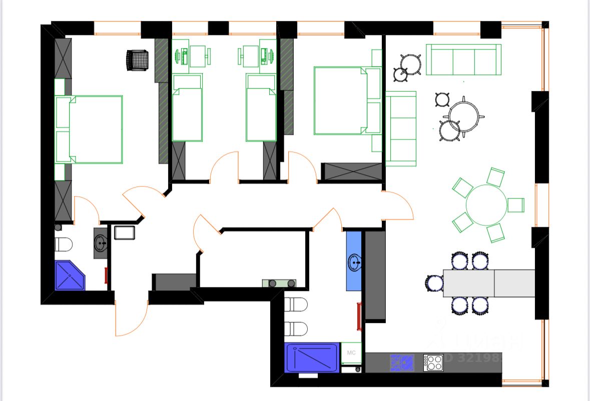По плану : большая кухня - гостиная, три изолированных комнаты- мастер спальная с ванной комнатой, две детских комнаты, два сан-узла, две гардеробные, хозяйственная комната, высокие потолки, панорамные виды из окон. На этаже всего три квартиры.