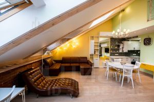 Вашему вниманию представлена уникальные двухуровневые аппартаменты с высокими потолками ..... Интерьер выполнен с использованием натуральных материалов, создавая атмосферу тепла и уюта. Функциональная планировка включает просторную гостиную совмещенную с современной кухней, две смежные спальни и двумя полноценными санузлами.