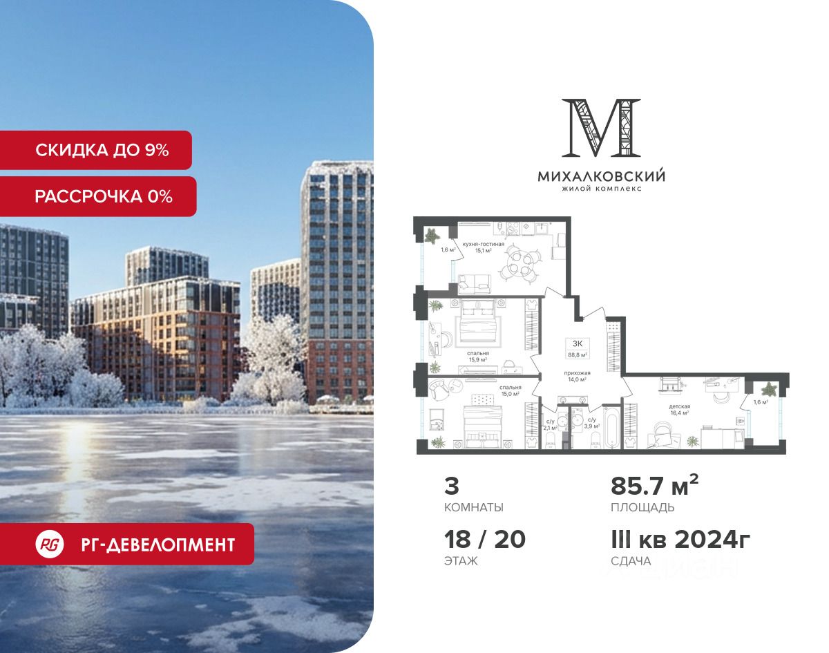 Продаётся 3-к квартира 85,7 кв.м. в ЖК "Михалковский" на 18-м этаже 20 этажного дома.