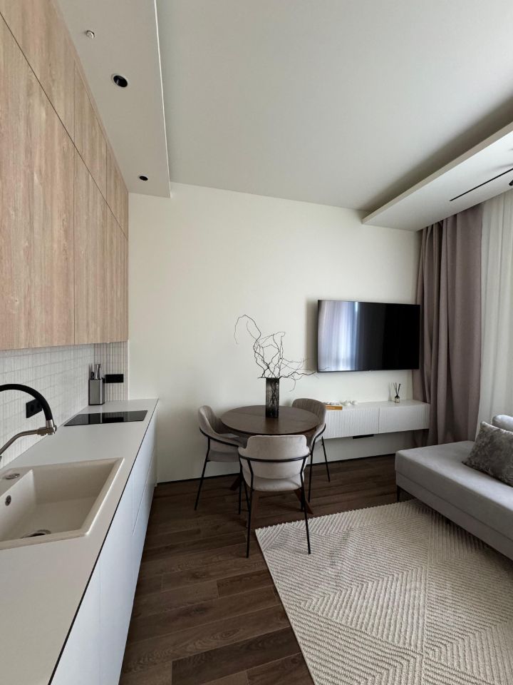 Свободная продажа, без обременений, полная стоимость в договоре. Вашему вниманию меблированное пространство с дизайнерской отделкой под ключ, где продуманно все до мелочей. Все пространства оснащены различными подсветками для создания различных световых сценариев. Проходные зоны выключателя в коридоре в спальне. Прихожая, ванная и гардероб у нас в керамогранит. Остальные зоны в кварцвиниле с повышенной износостойкостью. Высокие двери скрытого монтажа с магнитными замками. Высокие потолки выполнены из гипсокартона, с теневым профилем по периметру. Все окрашено износостойкой, премиум краской. Ванная : присутствуют мягкие подсветки, ниши в плитке для банной косметики, установлен датчик протечки, коллектор для воды и полностью удобный собранный коллекторный узел, промывные фильтра, полотенцесушитель, ванна 180х80 чугунная, зеркало с подсветкой и подогревом , теневой карниз для штор, вместительная система хранения для баночек и кремов. Гардероб: Предусмотрена система вентиляции, Удобное место хранения для повседневных вещей, а та же верхних вещей, обуви и бытовой химии, большой электрический щит, вмещающий автоматы по группам, узо для защиты от удара электрическим током, стиральная машина 12 кг с сушильной машиной 8 кг с тепловым насосом, а так же гладильная доска, утюг. Кухня Невероятно большая и стильная кухня с доводчиками, в которой уместилось все самое нужное и необходимое для комфортной жизни. Каменная мойка с удобным смесителем, с подключенным фильтром для воды, в мойке установлен измельчитель, встроенный диспенсер для подачи жидкого мыла. Посудомоечная машина с инверторным тихим двигателем и лучем на полу, показывающий время стирки. Варочная панель, вытяжка, духовой шкаф с конвекцией, посуда трансформер для готовки и запекания, сушка для посуды, фарфоровая посуда для сервировки стола и столовые приборы, профессиональные ножи для приготовления пищи, стильные дизайнерские бокалы и стаканы, встроенный холодильник и морозильная камера, розетки для дополнительной бытовой техники, подсветка рабочей поверхности, обеденный стол раздвижной, мягкие и комфортные стулья. Гостиная Удобный и большой раскладной диван , ковер, шторы и встроенный карниз для штор с возможностью подключения к Алисе , так же есть розетка за шторой для гирлянды или робота пылесоса, телевизор диагональ 65 дюймов со встроенной Алисой , матрица Qled, встроенный кабель канал в стене для подключения приставок без видимых проводов , тумба под телевизор . Апартаменты Спальня шторы, подсветка для штор, и встроенный карниз для штор с возможностью подключения к Алисе, кровать 180х200 и матрас средней жесткости, постельное белье из микровелюра, подушки микрогель двух размеров, сезонное одеяло. встроенные и вместительные шкафы с рабочей зоной и розетками для техники. Это апартаменты для тех, кто ценит стиль, удобство и технологичность. Здесь всё готово для комфортной жизни — от мебели и техники до аксессуаров и текстиля. Вам остаётся только привезти личные вещ