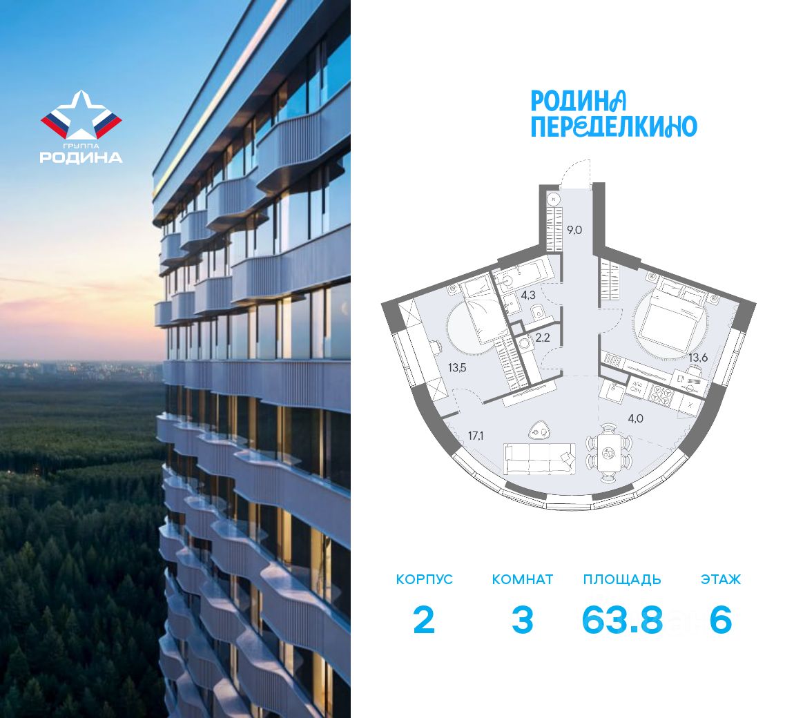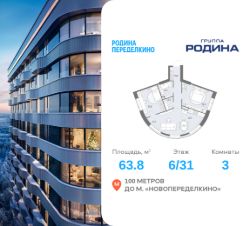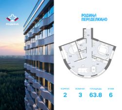 Продаётся 3-комнатная квартира площадью 63.8 м² на 6 этаже в Жилом Комплексе "Родина Переделкино".