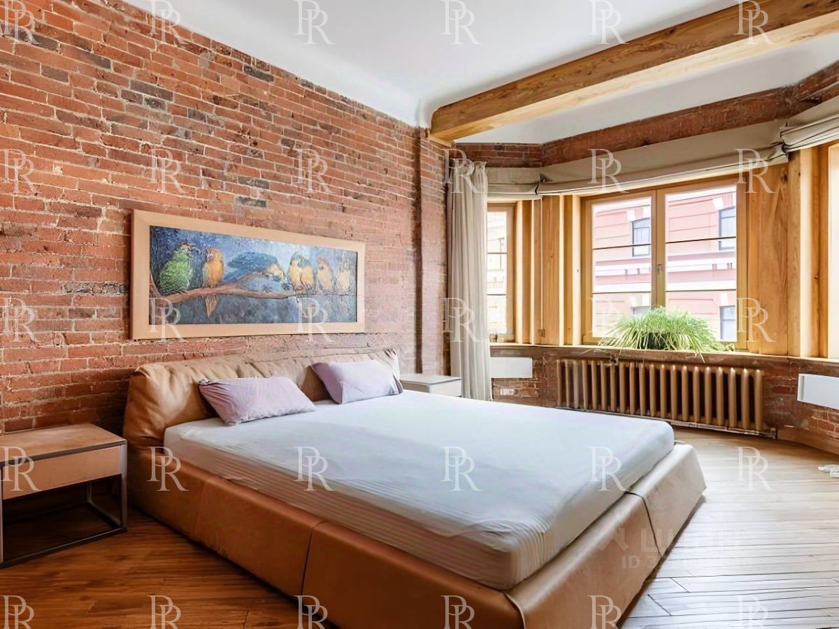 Окна просторной гостиной, занимающей целую фасадную линию здания, открывают захватывающий вид на знаменитый Патриарший пруд и уютную улицу Малая Бронная. Интерьер квартиры украшен качественной европейской мебелью и современной японской техникой, подчеркивая высокий уровень комфорта и стиля жизни.