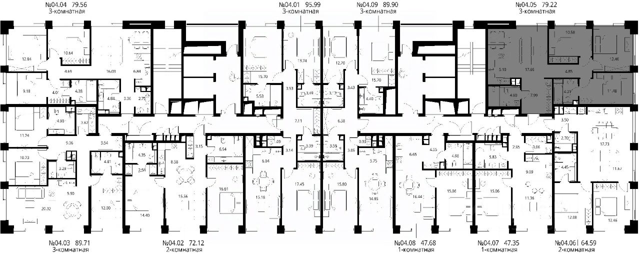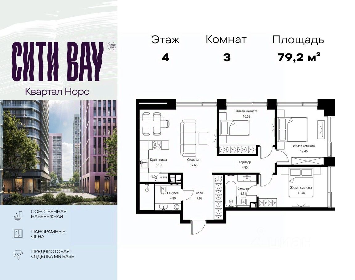 Продаётся 3-комнатная квартира общей площадью 79.22 м² с предчистовой отделкой в ЖК Сити Бэй, квартале Норс, на 4-м этаже 10 этажного дома.