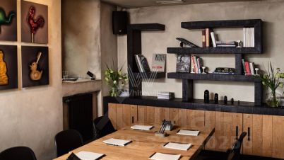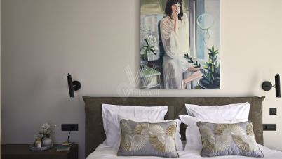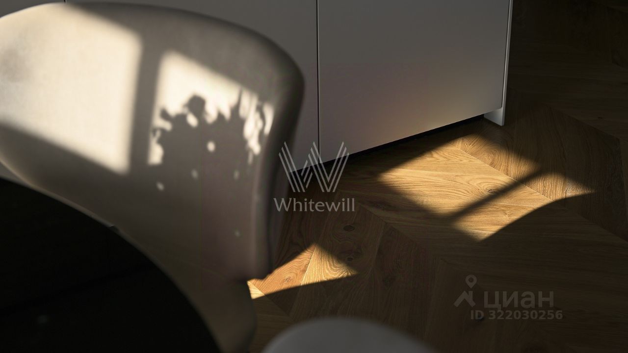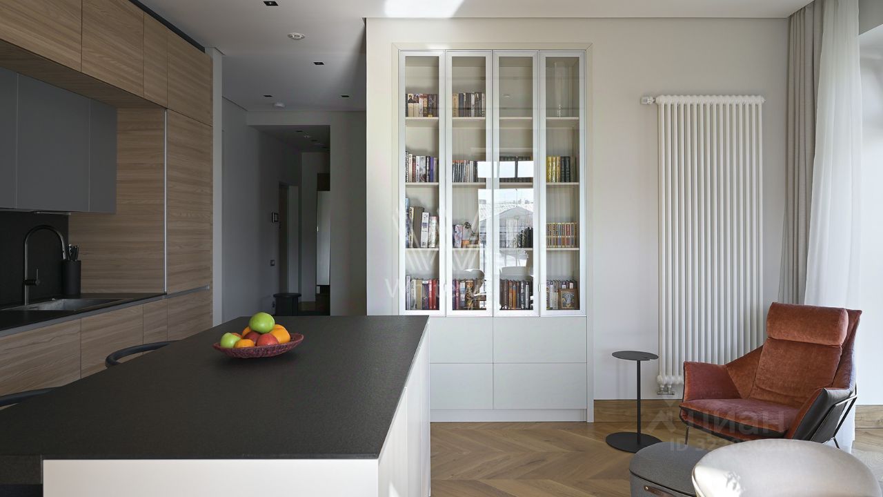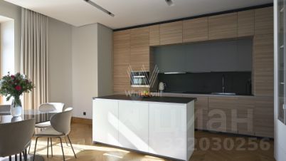 Апартаменты с одной спальней площадью 96 м² в клубном доме Moss Apartments. Отделка в светлых лаконичных тонах с использованием натуральных материалов, на полу выложен паркет из массива дуба. Интерьер укомплектован мебелью и техникой из Италии и США — кухонный гарнитур от итальянской фабрики Valcucine, встроенная бытовая техника Miele, сантехника Villeroy&Boch.