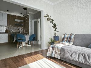 В квартире выполнен дизайнерский ремонт, поэтому она готова к комфортному проживанию. Просторная кухня оснащена современной техникой и стильной мебелью. Санузел совмещенный, оформлен в светлых тонах, что создает дополнительное ощущение простора. Планировка квартиры продумана для удобства и функциональности.