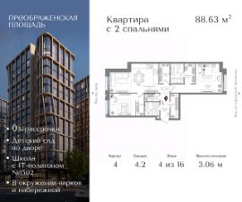 Квартира на 4 этаже в жилом комплексе премиум-класса "Преображенская площадь". Общая площадь: 88.63 кв.м.