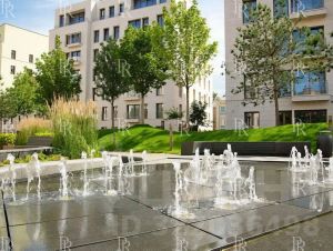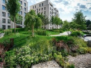 Центральное пространство комплекса — приватный сад площадью 0,8 га. Концепция озеленения реализована британским бюро Gillespies: ручей, фонтан, прогулочные маршруты, вечнозелёные деревья, теневые зоны отдыха и авторская детская площадка от Richter Spielgeraete.