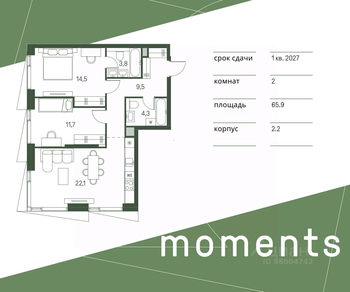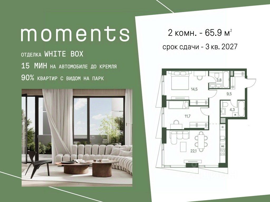Продается 2-к. квартира номер 1228 общей площадью 65.9 кв.м. на 26-м этаже 34 этажного дома, корпус 2.2. С отделкой White Box.
