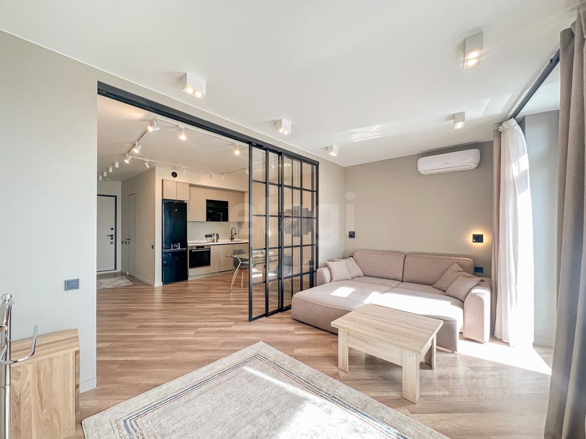 Объект отличается продуманной свободной планировкой: изолированная спальня, кухня-гостиная и совмещенный санузел. Ключевым преимуществом является высокое качество исполнения: установлена корпусная мебель на заказ, включая шкаф-купе и кухонный гарнитур с встроенной техникой (посудомоечная машина, холодильник, конвекционная плита), обеденная группа, диван и кондиционер. Вся мебель и техника остаются новому владельцу. Большие панорамные окна выходят на запад, обеспечивая уникальные видовые характеристики, особенно в вечерние часы, и обеспечивают обилие естественного света.