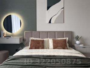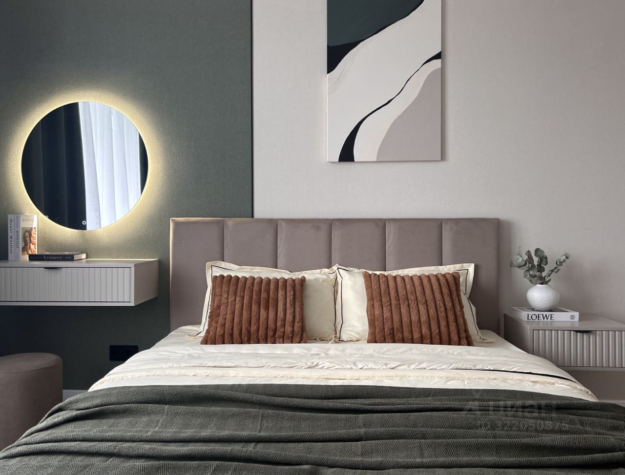 В спальне расположена комфортная двуспальная кровать с мягким изголовьем и подъемным механизмом, позволяющее использовать пространство под ней в качестве дополнительной зоны хранения, а также большая гардеробная комната.