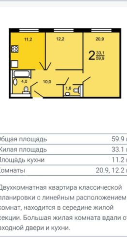 Продается светлая и уютная 2-комнатная квартира площадью 59.7 кв. м на 7 этаже современного 25-этажного монолитного дома, построенного в 2021 году. Квартира расположена на Люблинской улице, всего в 12 минутах пешком от метро Перерва. Высота потолков составляет 2.62 метра, жилая площадь — 33.1 кв. м, комнаты 20,9+12,2 кв.м., а кухня — просторные 11.2 кв. м.