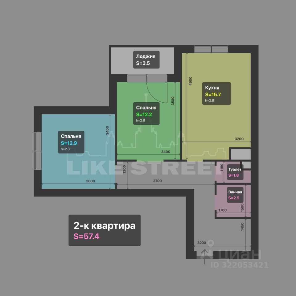 Продается 2-комнатная квартира 57.4 м² в новостройке
