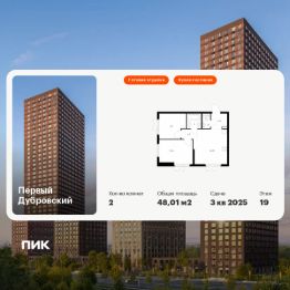 Продаётся 2-комн. квартира площадью 48,01 кв.м на 19 этаже 38 этажного дома (Корпус 1.4, Секция 2) проекта ПИК Первый Дубровский. Светлый просторный подъезд на уровне земли, функциональная планировка, большие окна, c отделкой.