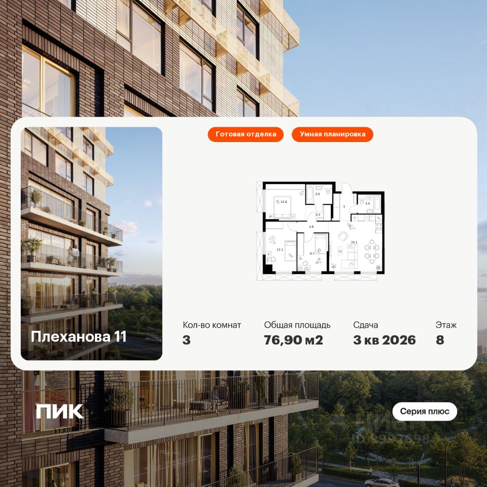 Продаётся 3-комн. квартира площадью 76,9 кв.м на 8 этаже 24 этажного дома (Корпус 1.4, Секция 4) проекта ПИК Плеханова 11. Светлый просторный подъезд на уровне земли, функциональная планировка, большие окна, c отделкой.