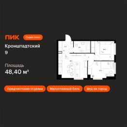Продаётся 2-комн. квартира площадью 48,4 кв.м на 3 этаже 32 этажного дома (Корпус 1.1.3, Секция 3) проекта ПИК Кронштадтский 9. Светлый просторный подъезд на уровне земли, функциональная планировка, большие окна, предчистовая отделка.