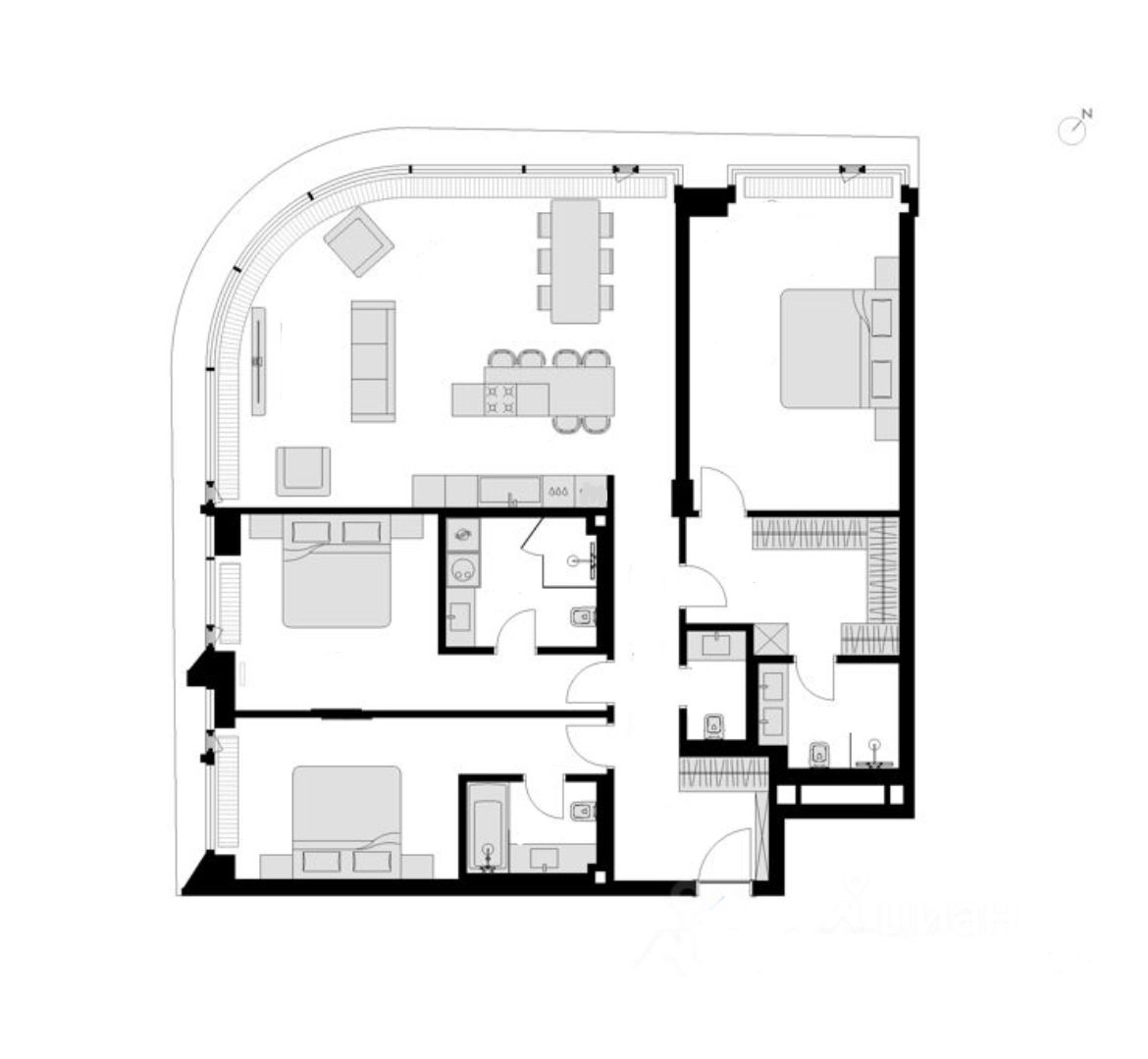 Отделка от застройщика в стиле Неодеко с серым мрамором. Полукруглые окна выполнены фирмой Schuco, система вентиляции приточно-вытяжная.