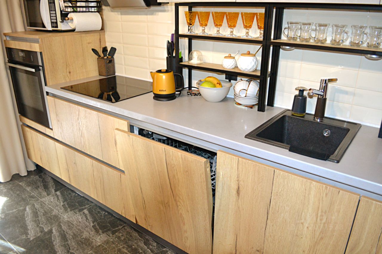 Новым собственникам остается современная кухня со встроенной техникой (холодильник, ПММ, варочная панель, духовка, вытяжка), обеденный стол со стульями.
