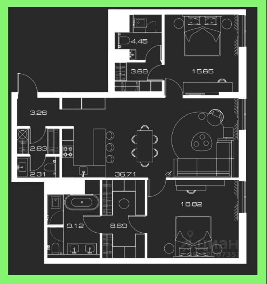 - просторная видовая гостиная площадью 35,6 кв.м. располагается В ЦЕНТРЕ квартиры, то есть спальни не имеют общих межкомнатных стен, что создает приватность для каждого члена семьи.