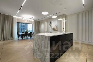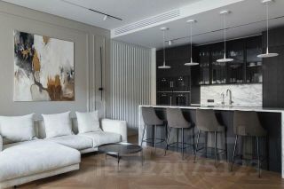 Просторная кухня-гостиная с панорамными окнами и видом на Москва-Сити,