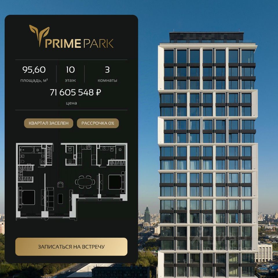 Жилой квартал Prime Park воплощает все преимущества premium-living. Престижная локация на Ленинградском проспекте, 37: - 5 мин. от Тверской улицы, Патриарших прудов и Белой площади, - 20 мин. до аэропорта "Шереметьево" или "Москва-Сити", - 4 парка — Ходынское поле, Петровский и Чапаевский парки, Березовая роща, - 4 станции метро — "ЦСКА", "Аэропорт", "Динамо" и "Петровский парк". Многократный победитель премий European Property Awards и Urban Awards, а также на протяжении пяти лет остается самым продаваемым проектом в своем сегменте. Premium-living Консьержи предугадывают желания резидентов и берут на себя выполнение практически любых бытовых задач. В квартале также есть парк-рейнджер и охрана. Для дополнительного удобства в МОПах предусмотрены почтовые комнаты, колясочные и комнаты для мытья лап домашних питомцев, комната для хранения интернет-заказов. Наличие сервисного входа для персонала позволяет разделить трафик, сохраняя приватную атмосферу в лобби. Резидентам нужно открыть только одну дверь, чтобы оказаться дома: valet-парковщики открывают дверь автомобиля и отвозят его на подземный паркинг, беллмены открывают двери при входе в башню и помогают донести вещи до квартиры, интеллектуальная система обеспечивает бесконтактный вызов лифта. Развитая инфраструктура Близость к центру Москвы, рядом крупнейший ТЦ "Авиапарк", ВТБ Арена, Мегаспорт, ВЭБ Арена, в окружении красивейших парков, включая ультрасовременный Ходынский парк площадью 25 га с панорамными качелями, набережной, фонтанами, детскими и спортивными площадками. На территории квартала предусмотрены приватный фитнес-центр с 25-метровым бассейном и спа, подземный паркинг с кладовыми, местами для хранения велосипедов, электрозарядками и детейлинг-центром для обслуживания автомобилей. На первых этажах башен расположатся кафе и рестораны, цветочный магазин, аптека, салон красоты, премиальный супермаркет и бытовые сервисы. Частный парк Общее парковое пространство квартала — 5,5 га, из них 3 га отведено под частный парк эксклюзивно для резидентов. Большой фонтан, аллеи для прогулок, крупномерные деревья, арт-инсталляции, водные глади, детские площадки и воркаут-зона создают гармоничное сочетание жизни на природе со всеми преимуществами мегаполиса. Уникальная квартирография Более 80 вариантов планировочных решений от однокомнатных квартир до двухуровневых дуплексов и пентхаусов. Панорамные окна, высокие потолки, мастер-спальни, балконы и террасы создают особенный комфорт и уют. Авторская архитектура и дизайн Четыре башни сданы, ключи выдаются в день сделки, 2 башни на этапе строительства, сдача в 2023 и 2024 гг. Уникальный архитектурный ансамбль и ландшафтный дизайн, благородные и ценные материалы в оформлении лобби, предметы искусства, арт-объекты и элементы декора, выполненные на заказ специально для Prime Park, становятся отражением яркой индивидуальности резидентов квартала.