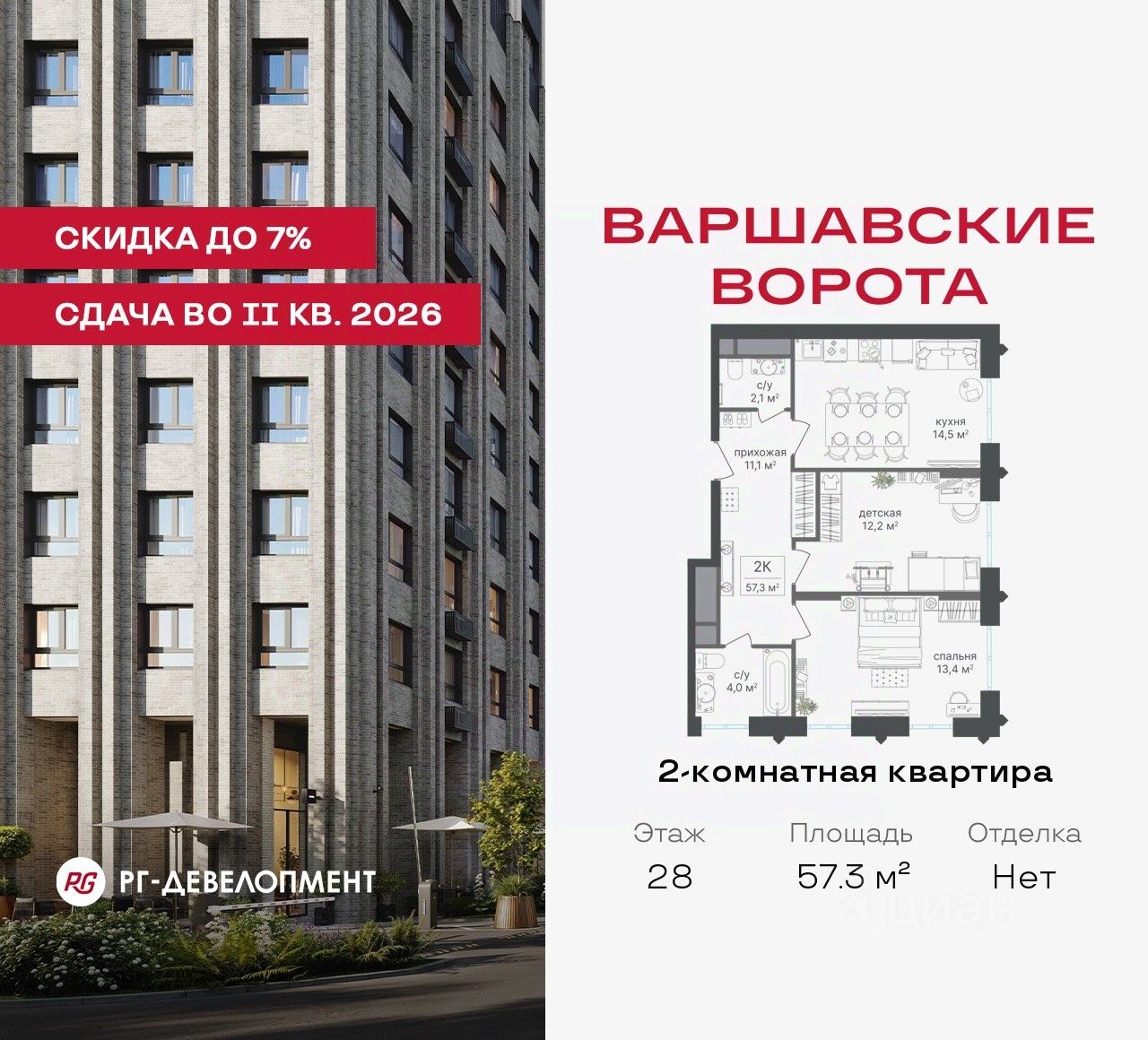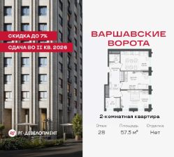 Продаётся 2-комнатная квартира 57.3 кв.м. в МФК "Варшавские ворота" на 28-м этаже 30 этажного дома. МФК "Варшавские ворота" — это точка баланса между природой и городом, стилем и функциональностью, жизнью сегодня и устойчивым будущим.