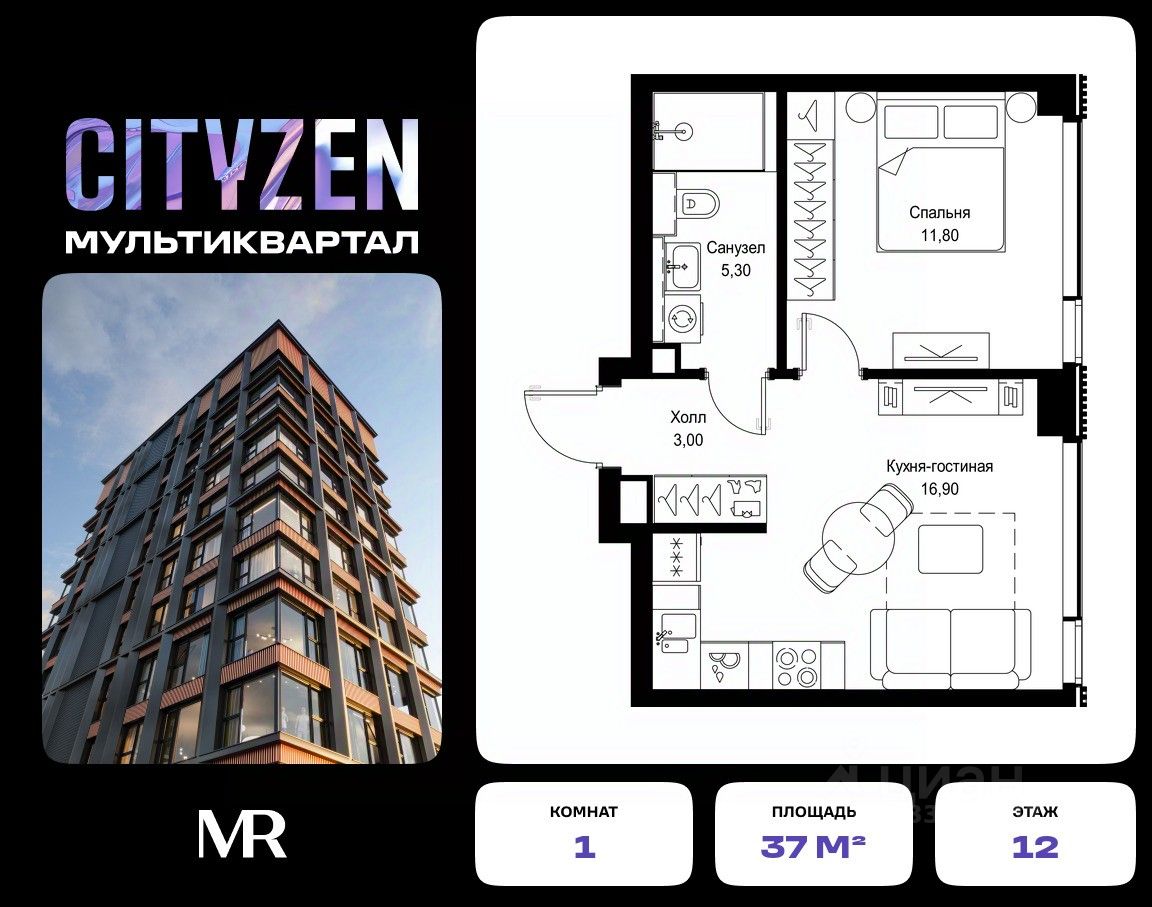 Продается 1-комнатная квартира от застройщика в жилом мультиквартале CITYZEN на 12-м этаже в корпусе #1 урбан-блока PARUS. Общая площадь лота составляет 37 м²