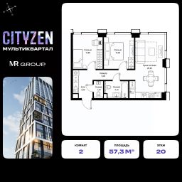 Продается 2-к квартира от застройщика в жилом мультиквартале CITYZEN на 20-м этаже в корпусе #3 урбан-блока PARUS. Общая площадь лота составляет 57.30 м²