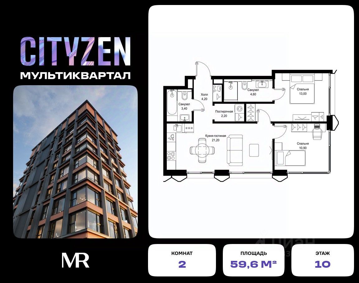 Продается 2-комнатная квартира от застройщика в жилом мультиквартале CITYZEN на 10-м этаже в корпусе #5 урбан-блока PARUS. Общая площадь лота составляет 59.60 м²